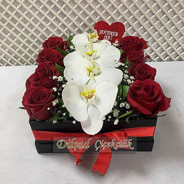 Kutu içinde k�rm�z� gül ve  beyaz orkide tasar�m çiçek kutusu